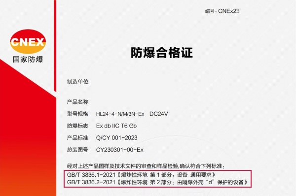 - 产品型号规格书:标注产品名称、型号、防爆标志、额定参数、适用环境温度;